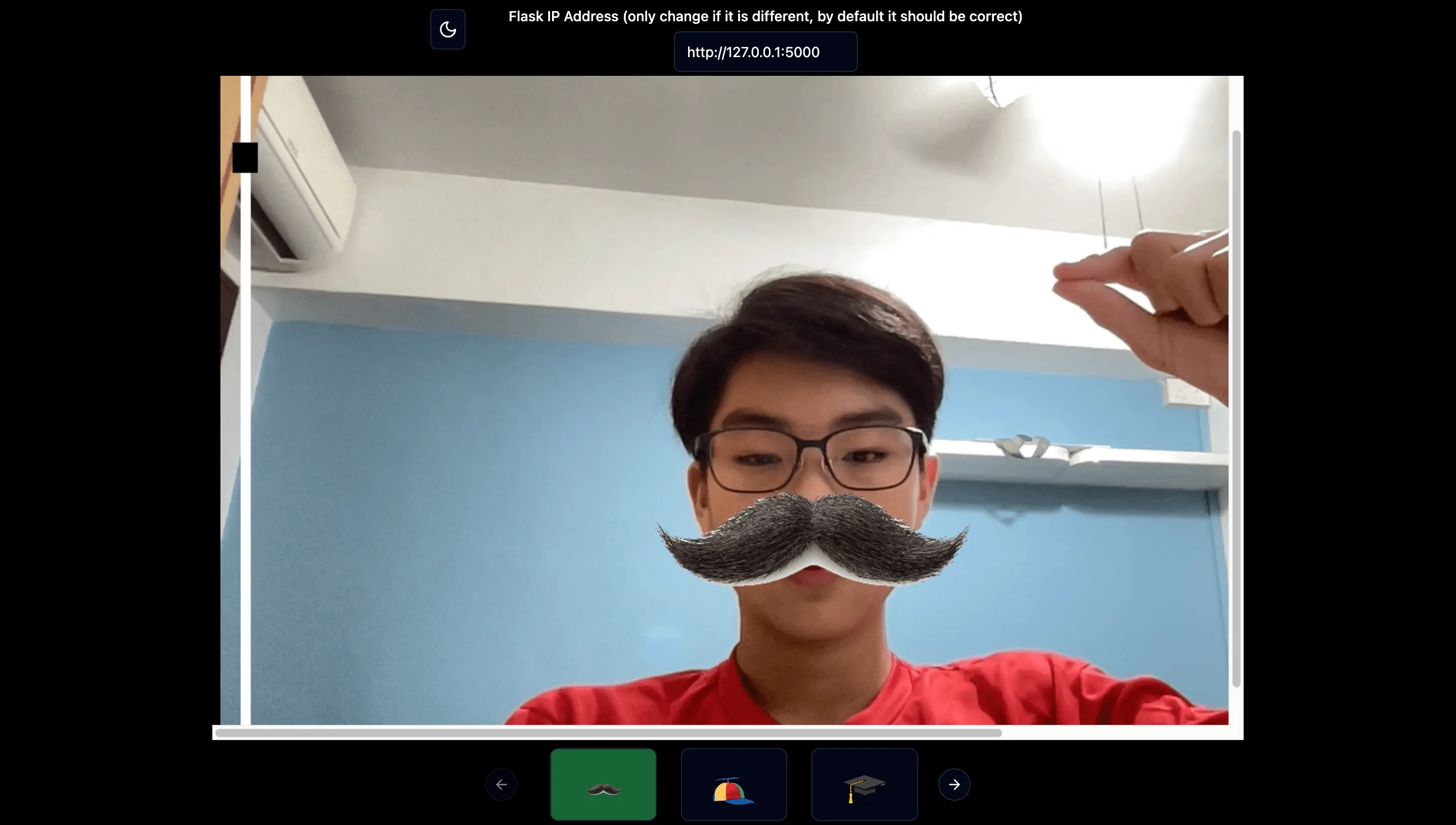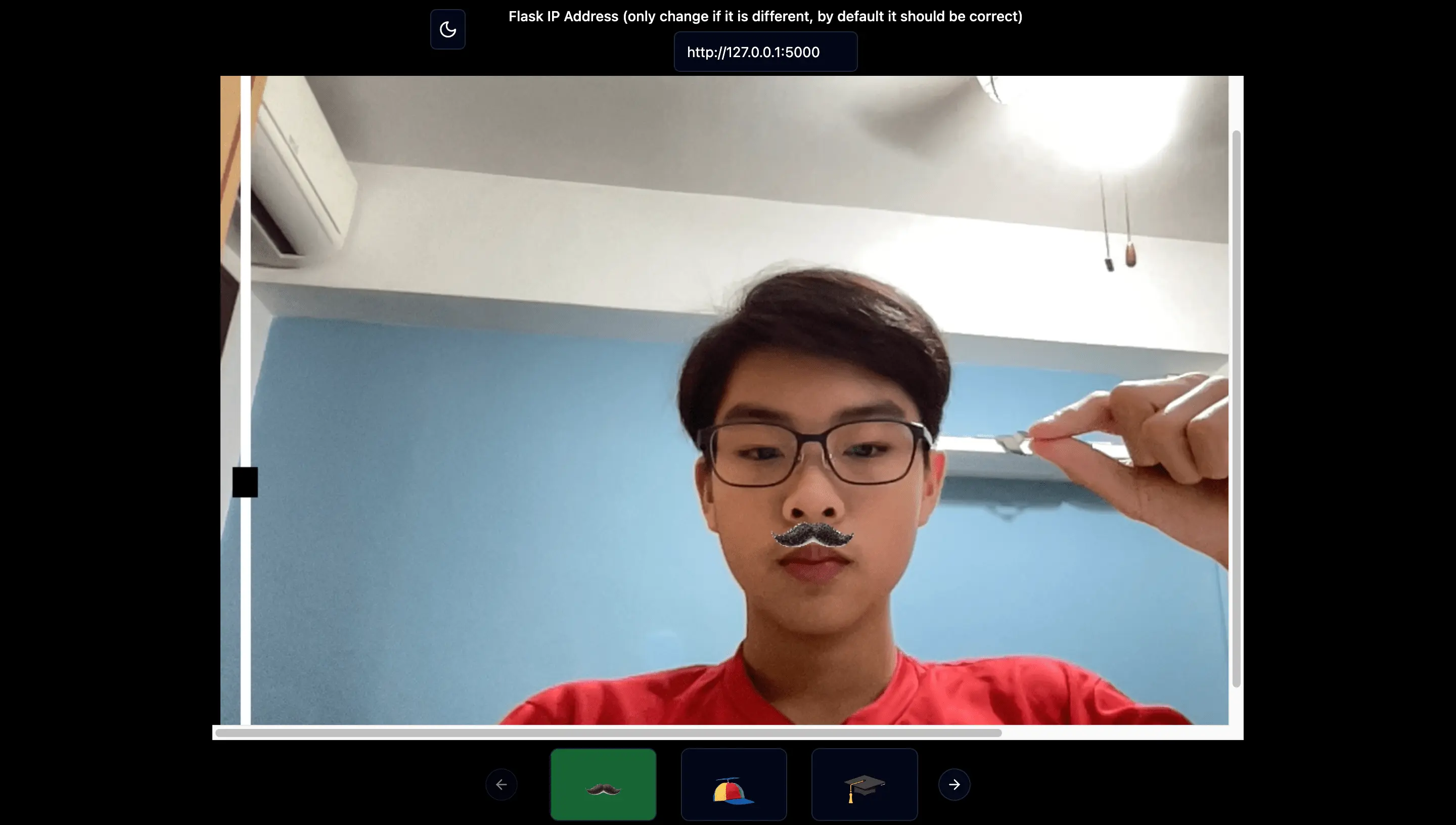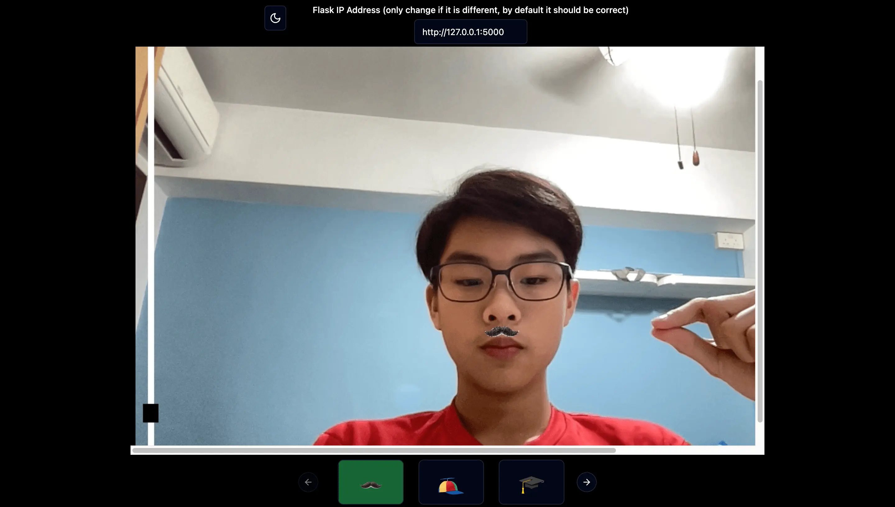 Face Filter is a web app that allows users to apply filters to their faces in real-time. It uses OpenCV to detect faces and apply filters to them. The user can also change the size of the filter by pinching and dragging their fingers up and down, a feature that has never been implemented before. Check out the "Demonstration" section on the GitHub for a video demonstration. The app is built with Vite and Flask.